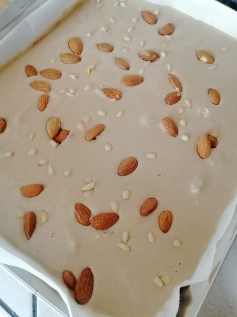 Reserva el resto de los frutos secos para decorar la superficie antes de hornear.