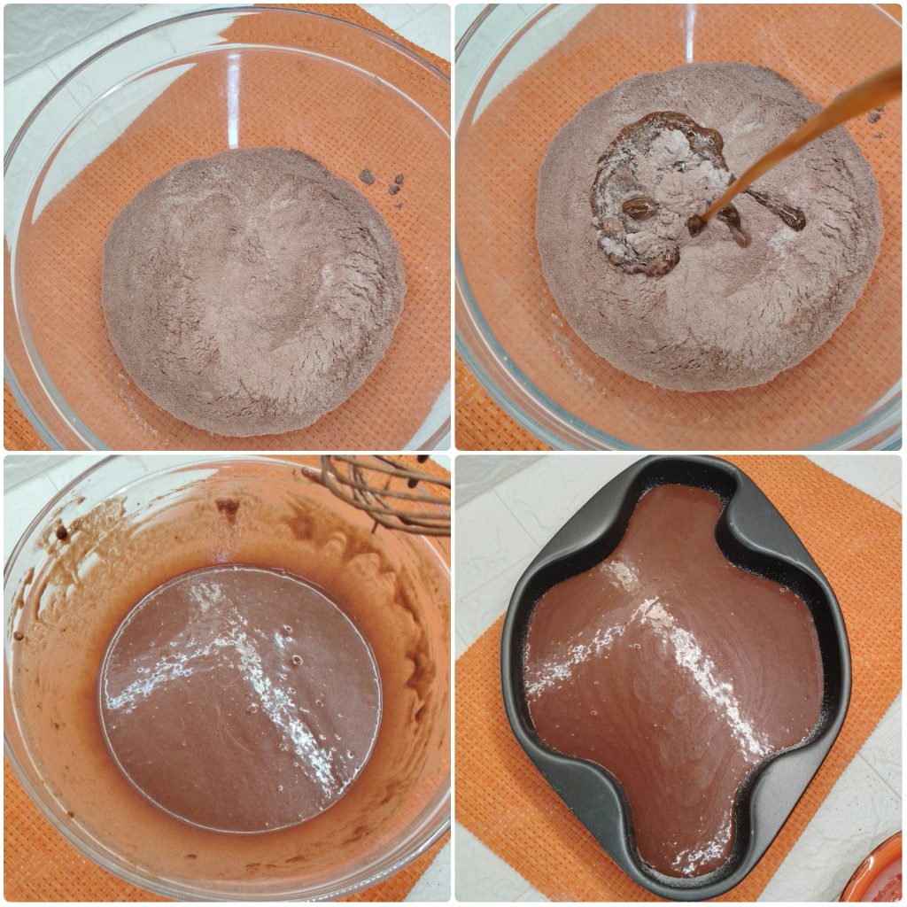 Aparte, en un jarro o en un vaso grande, mezclad el agua y el aceite de semillas, asegurándoos de disolver bien el azúcar. Verted esta mezcla líquida poco a poco sobre los secos, removiendo hasta obtener una masa que quedará bastante líquida.Verted todo dentro de un molde (yo usé el de forma de colomba, pero también sirve uno rectangular de 30×20 o redondo de 26 cm) previamente engrasado y enharinado.