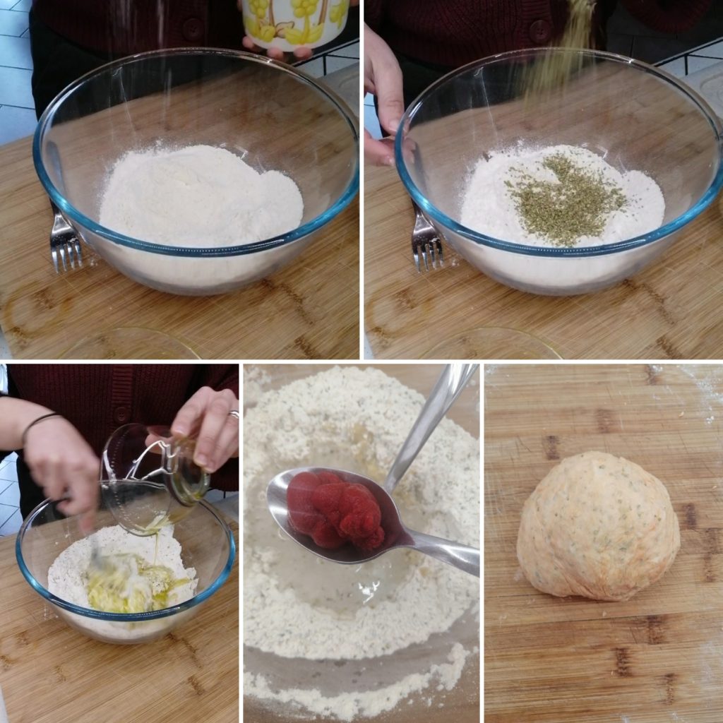 En un bol grande, verter la harina, el pecorino rallado, la sal y el orégano seco, luego mezclar bien para combinar los ingredientes secos.