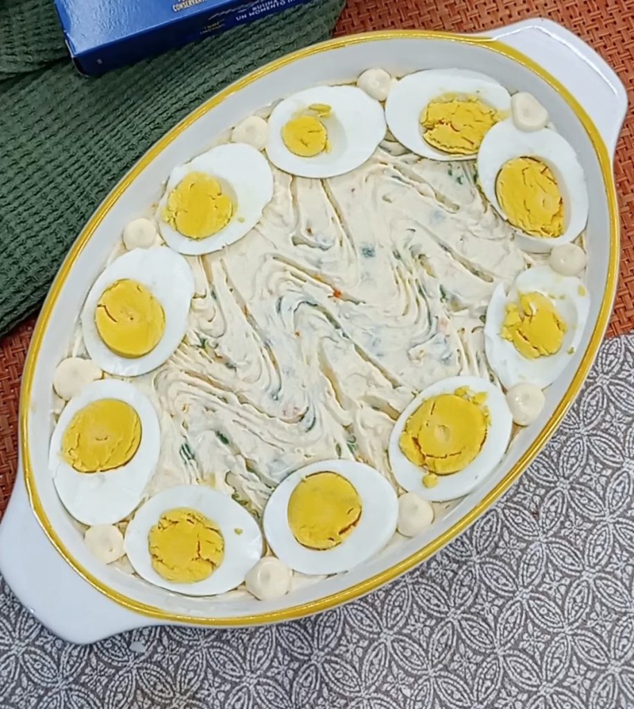 Decora al gusto con huevos duros, pepinillos, champiñones, pimientos en tiras o lo que prefieras, añadiendo también algunos toques de mayonesa extra.