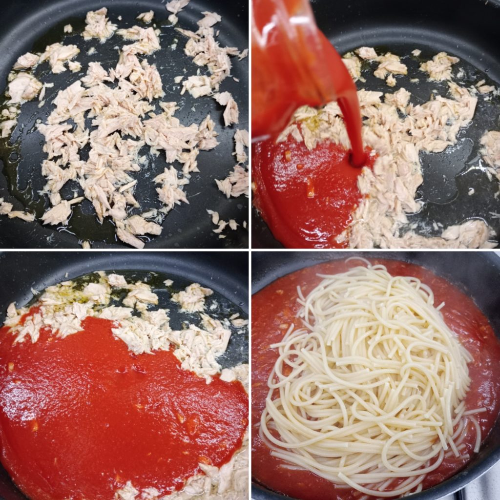 Mientras tanto, poner una cacerola con un poco de aceite en el fuego y verter dentro el atún escurrido previamente, después de unos minutos añadir también el puré de tomate, salar un poco, añadir guindilla si lo deseáis, y dejar cocinar.