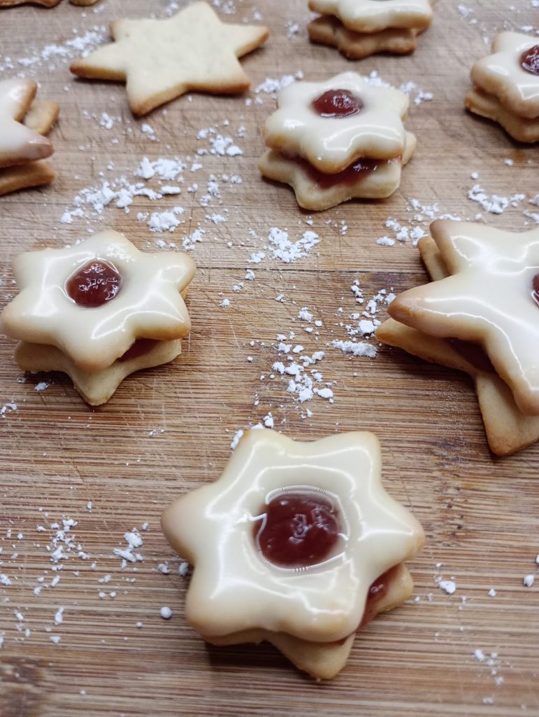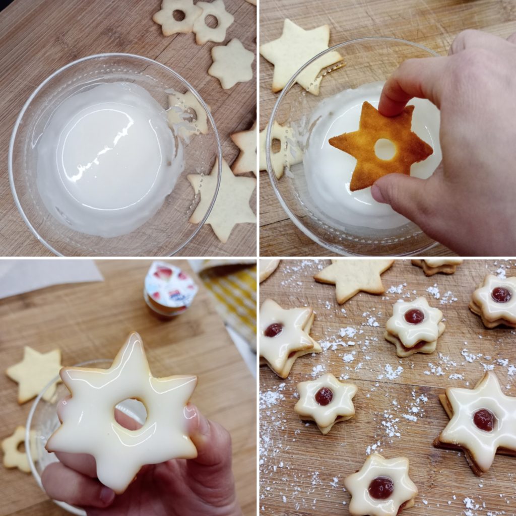 He preparado la masa, cocido las diferentes formas y luego he hecho una simple glaseado con azúcar glas y agua. Antes de rellenarlos, los he glaseado en la superficie.