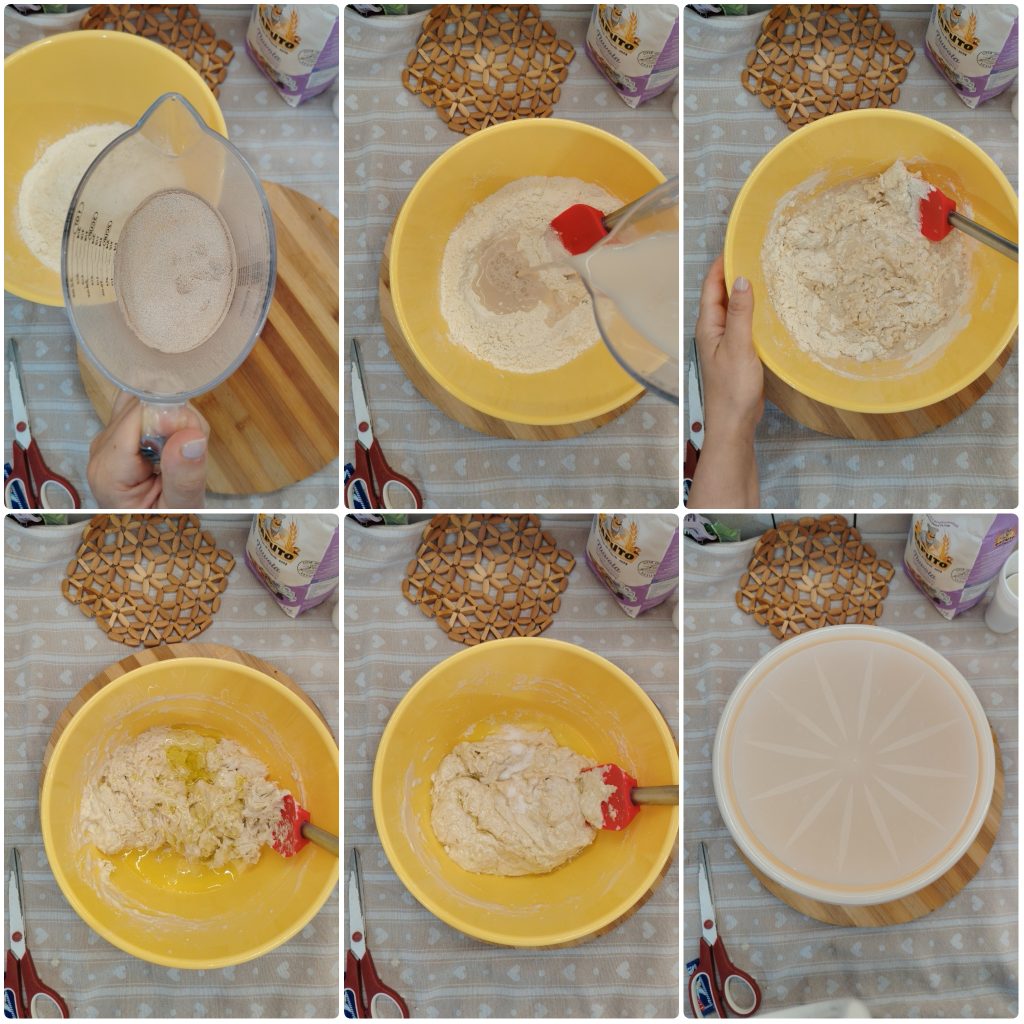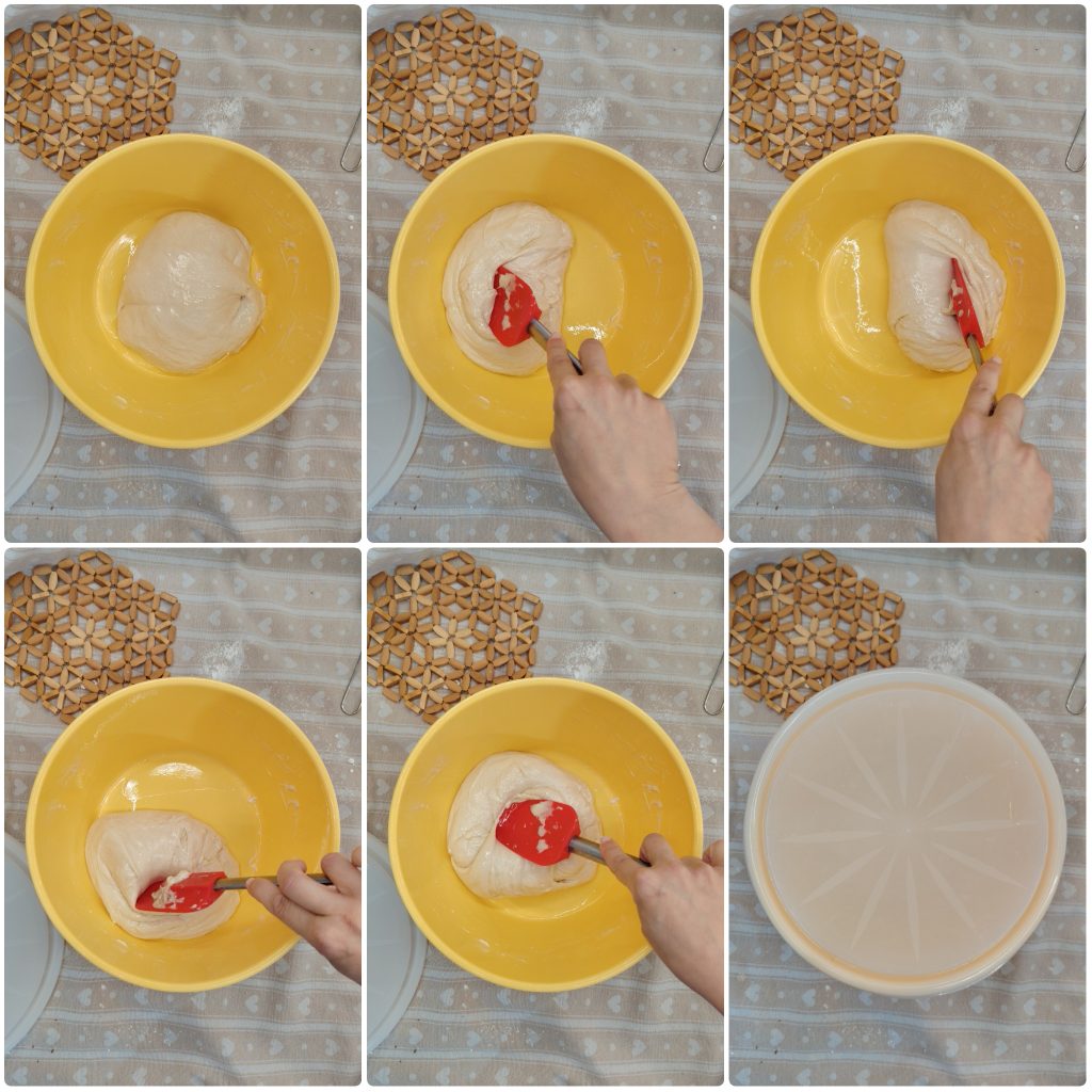 Pasados los 20 minutos es el momento de hacer una tanda de pliegues con la ayuda de una espátula: llevad la masa de la izquierda al centro, de la derecha al centro, de arriba al centro y, por último, de abajo al centro. Una vez hechos estos pliegues, dejad reposar en un lugar cálido durante dos horas.