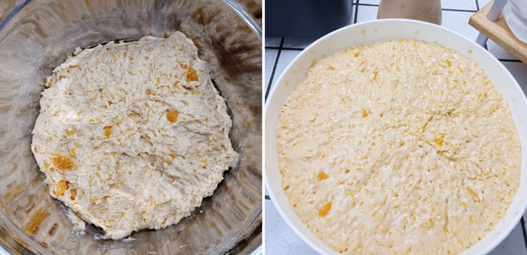 Solo un simple paso: cocinar la calabaza al vapor o en sartén, triturarla e incorporarla directamente en la masa. El resultado es una focaccia maravillosamente suave y sabrosa, enriquecida con un magnífico color naranja.