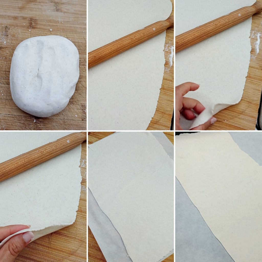 Una vez extendida la lámina, dividirla en dos, si no lo has hecho ya, y colocar en una bandeja cubierta con papel de horno.