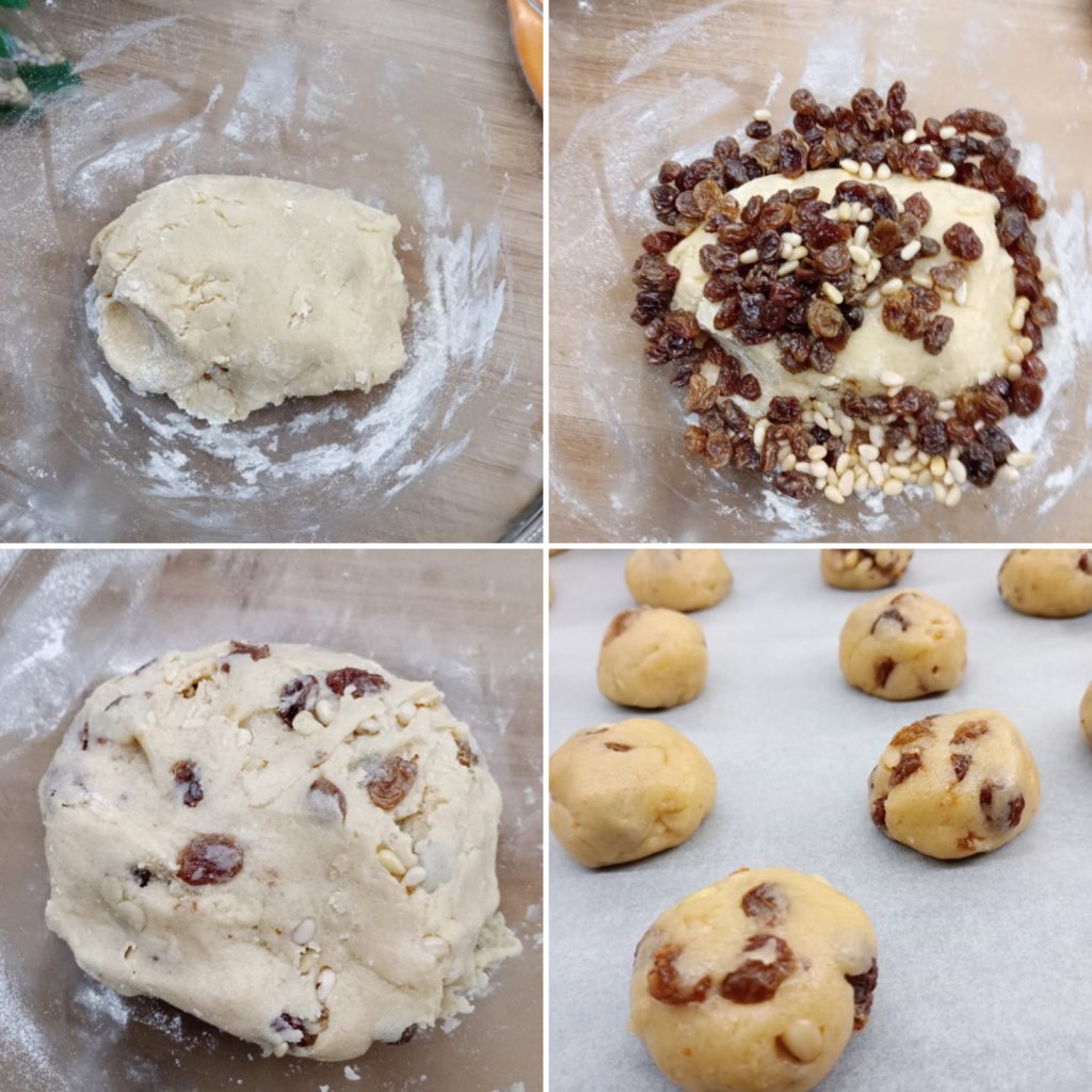 trabajar el azúcar y el huevo con un tenedor, añadir el aceite y mezclar bien. Comenzar a agregar la harina en varias veces junto con la levadura, una vez que el pan comience a tomar forma añadir también las pasas y los piñones y amasar. Una vez que todos los ingredientes estén bien mezclados, comenzar a tomar pequeños trozos de masa y con la palma de las manos formar bolitas y colocarlas en una bandeja forrada con papel de horno.