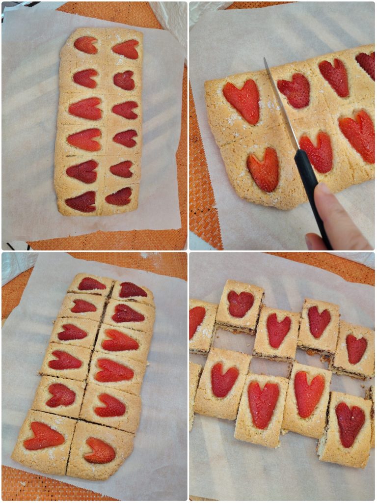 La preparación está realmente al alcance de todos. No hace falta formar cada galleta: basta extender una sola masa, rellenarla y decorarla con las fresas frescas cortadas por la mitad, que al hornearse desprenden todo su aroma. Una vez fuera del horno, solo habrá que cortar en cuadritos para obtener unos pastelitos preciosos y aún más sabrosos. La combinación entre la nota intensa de la avellana y la frescura de la fresa es un éxito seguro.