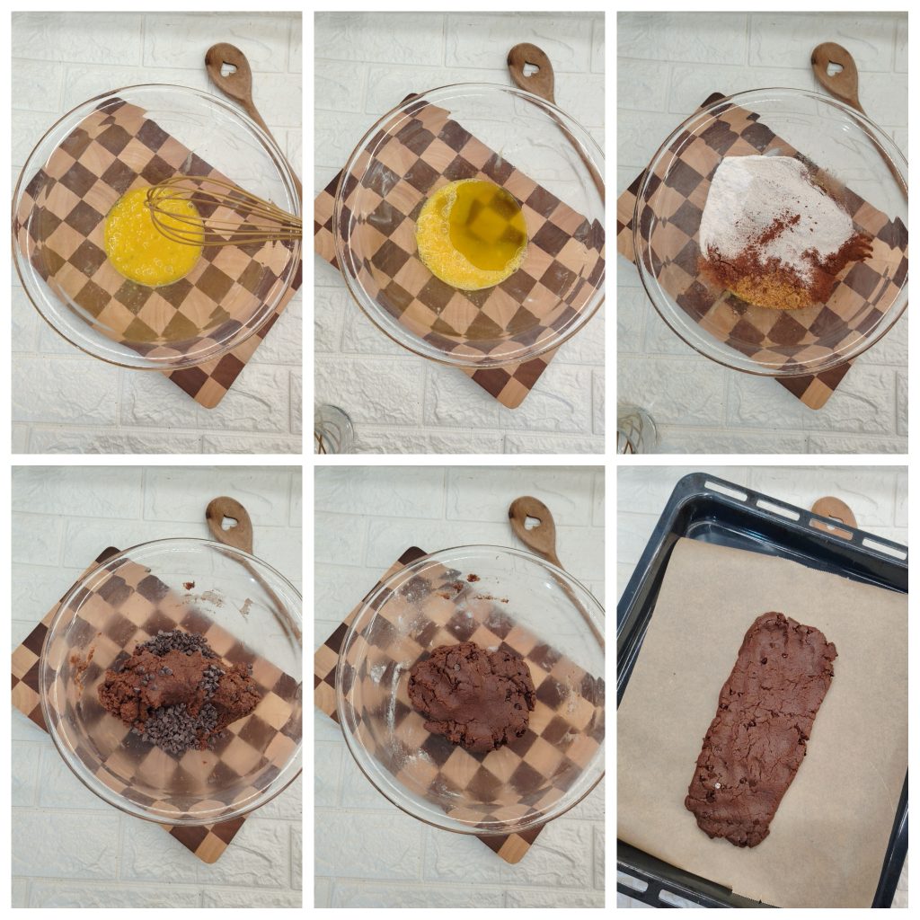 En un bol, batir el huevo con el azúcar granulado y el aceite de oliva virgen extra (o de semillas). Añadir la harina de trigo sarraceno, la harina de arroz y el cacao amargo en polvo. Empezar a amasar y añadir las láminas o gotas de chocolate.