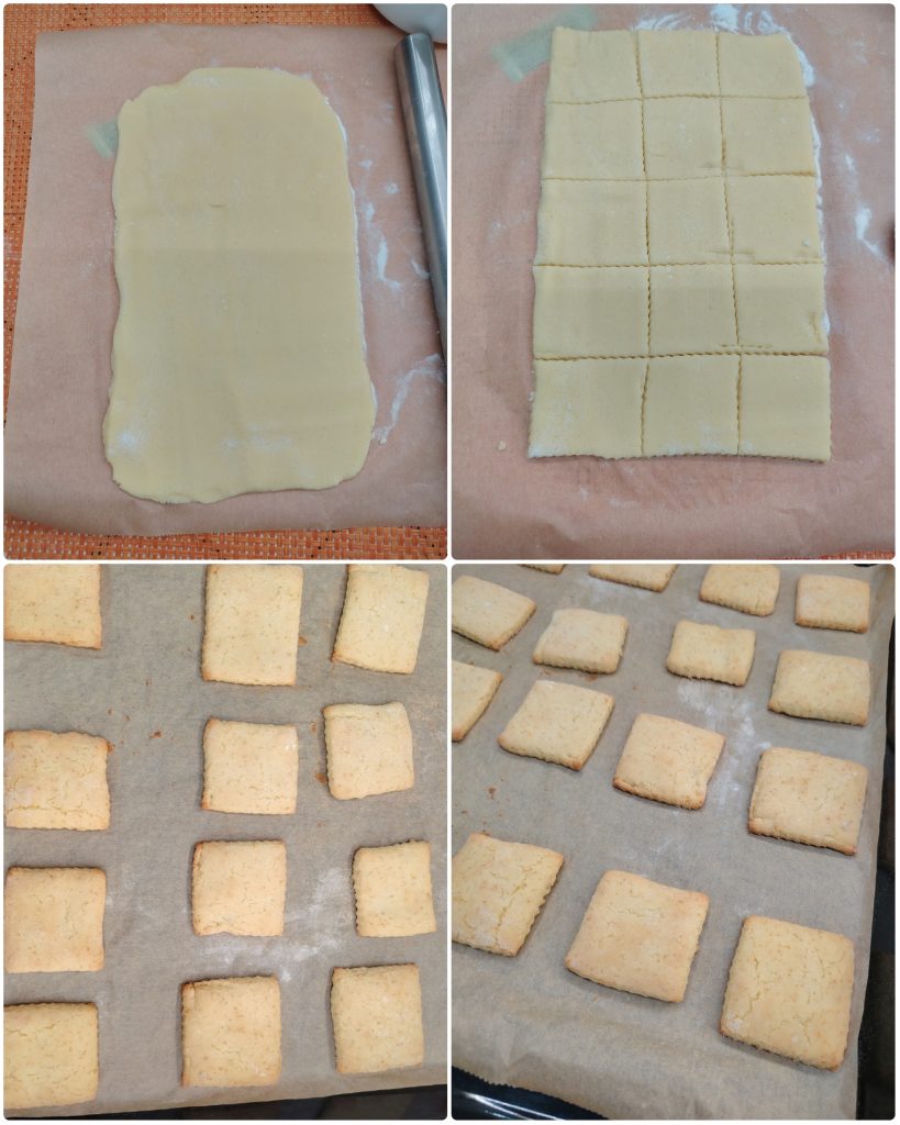 • Yo hice un rectángulo de 25×15 y luego corté las galletitas en trozos de 5×5. Vosotros, por supuesto, podéis usar cortadores o darle el grosor y tamaño que prefiráis.