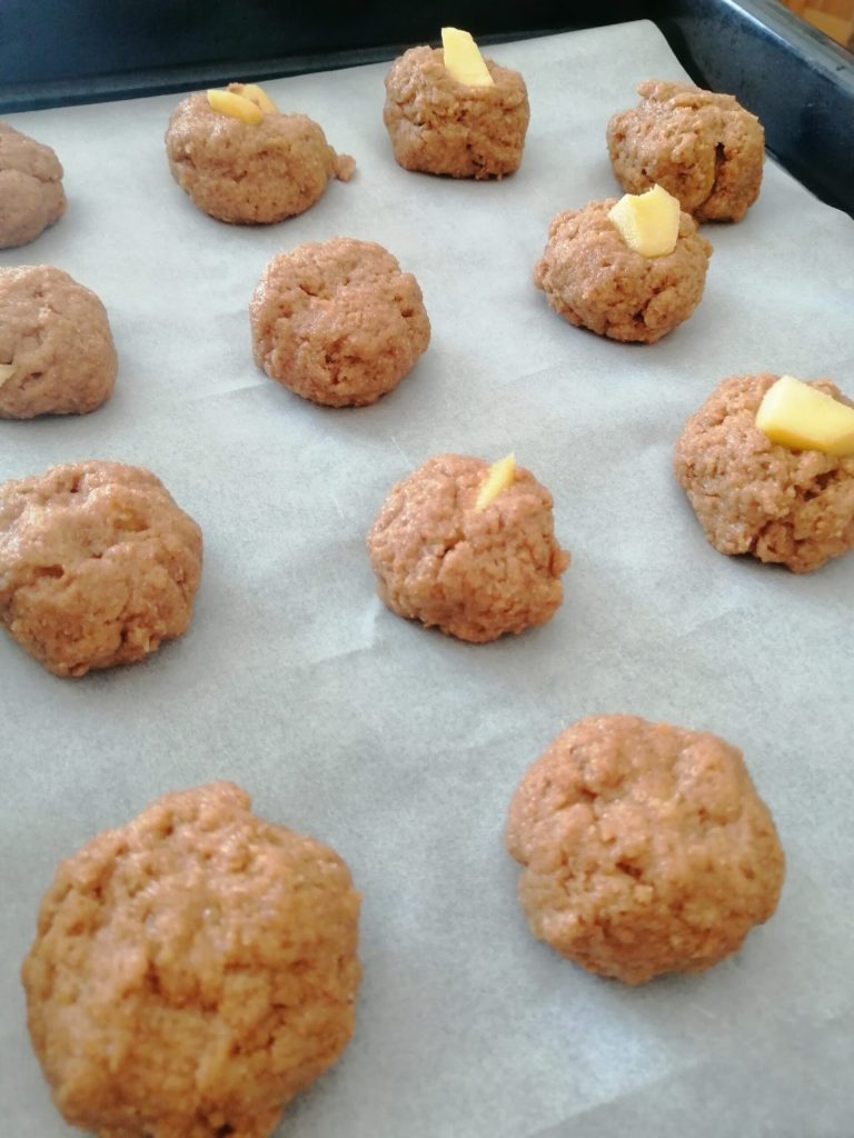 Una vez que la masa está lista, tomar un pedacito y aplastarlo ligeramente entre las manos, poner en el centro los trocitos de nectarina, cerrar la masa sobre sí misma y formar una bolita.