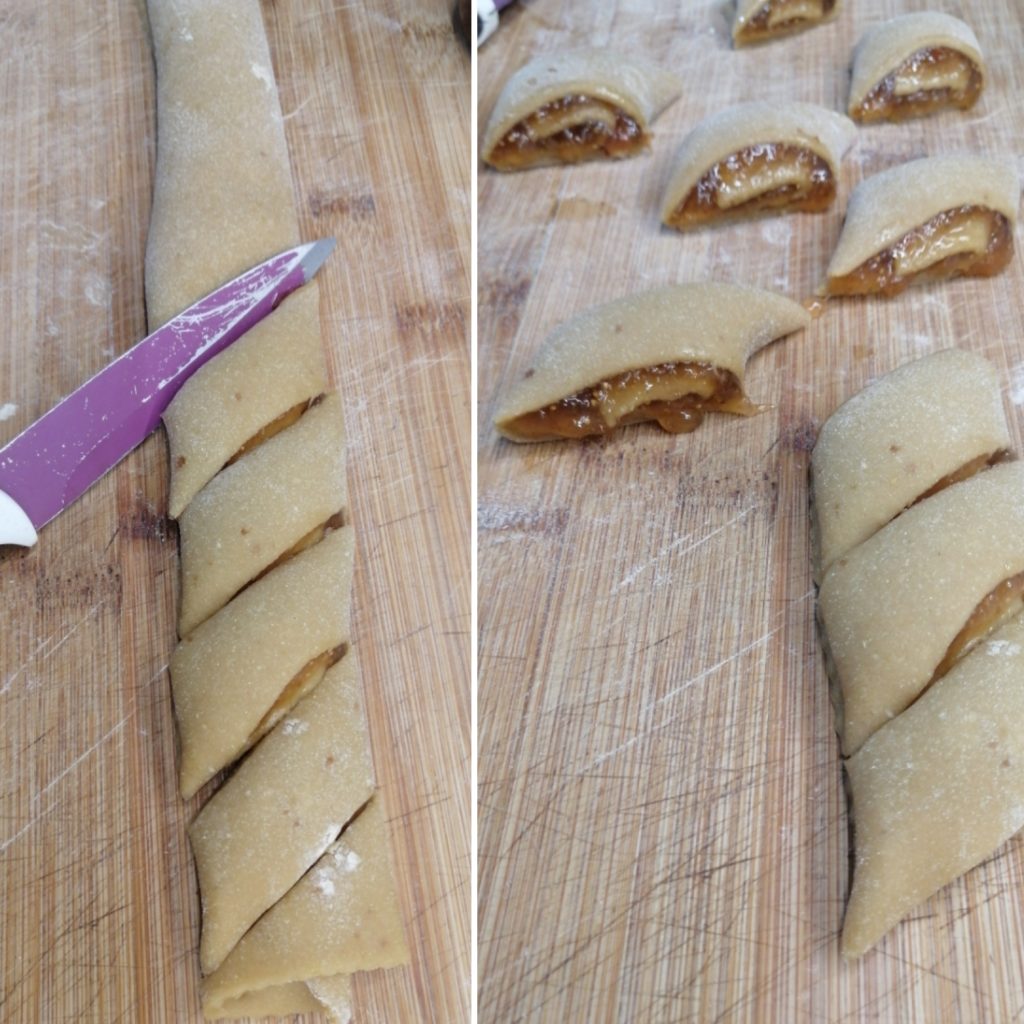 He extendido la masa, colocado y nivelado la mermelada de higos y he enrollado la masa sobre sí misma. Con un cuchillo de hoja lisa he creado unas galletitas largas.