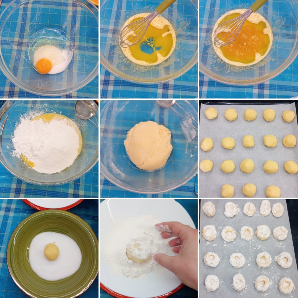 Prepara dos platillos: uno con azúcar granulada y otro con azúcar glas. Toma pequeñas porciones de masa, aproximadamente 35 g cada una, y forma bolitas.