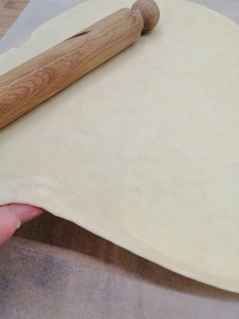 Tomad la masa y estiradla con un rodillo sobre una hoja de papel de horno o sobre una superficie de trabajo ligeramente enharinada, tratando de obtener un grosor fino y uniforme.