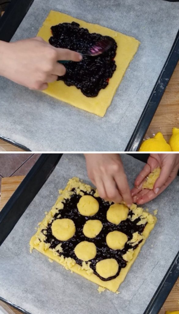 Extender la masa directamente sobre papel de horno y colocarla en el molde (o directamente sobre la bandeja, creando la base). Rellenar con mermelada de arándanos y decorar la superficie con la masa sobrante.