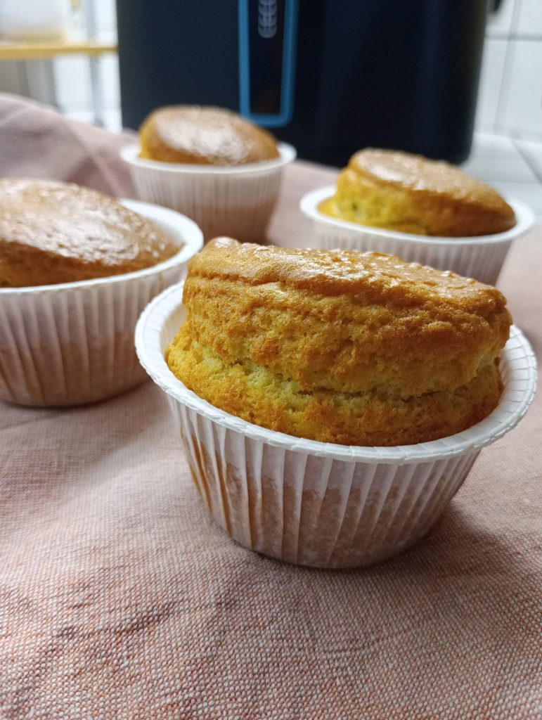 Muffin rapidísimos cocidos en freidora de aire. Hoy os propongo unos dulces exquisitos, suaves y delicados, perfectos para vuestro desayuno o una merienda rápida. Preparar estos muffins esponjosos es verdaderamente facilísimo: solo necesitaréis cinco minutos para la masa y apenas diez minutos para la cocción directamente en freidora de aire. Son ideales para quien tiene poco tiempo para dedicar a la preparación de un dulce goloso. Estos muffins que os propongo son con sabor a vainilla, con un irresistible corazón de chocolate. La cocción en freidora de aire nos ayuda a reducir a la mitad el tiempo y el resultado es realmente sorprendente: ¡os aseguro que estos muffins son súper esponjosos!