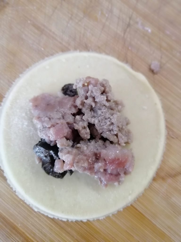 Toma el disco grande y coloca en el centro la mezcla de carne y aceitunas. Coloca encima el disco pequeño y comienza a pellizcar los bordes hacia adentro para unir firmemente.