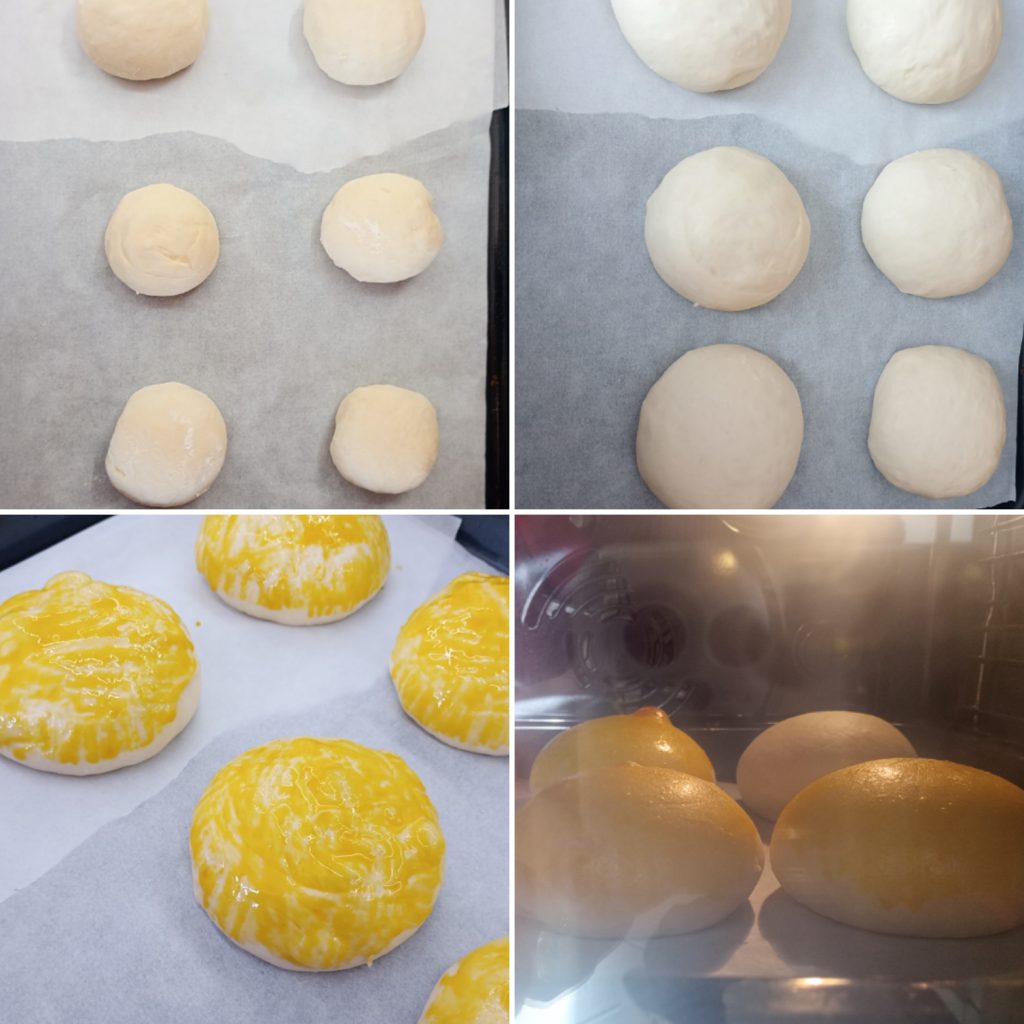 Cubrir con film y volver a dejar reposar en el horno con la luz encendida durante 30 minutos. Pasado el tiempo de la segunda fermentación, pincelar con una yema de huevo previamente batida.