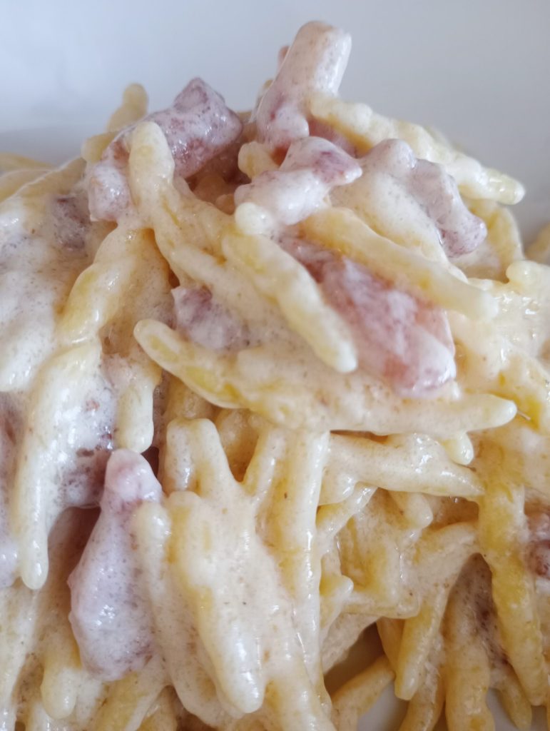 La pasta cremosa con guanciale robiola está lista para ser devorada.