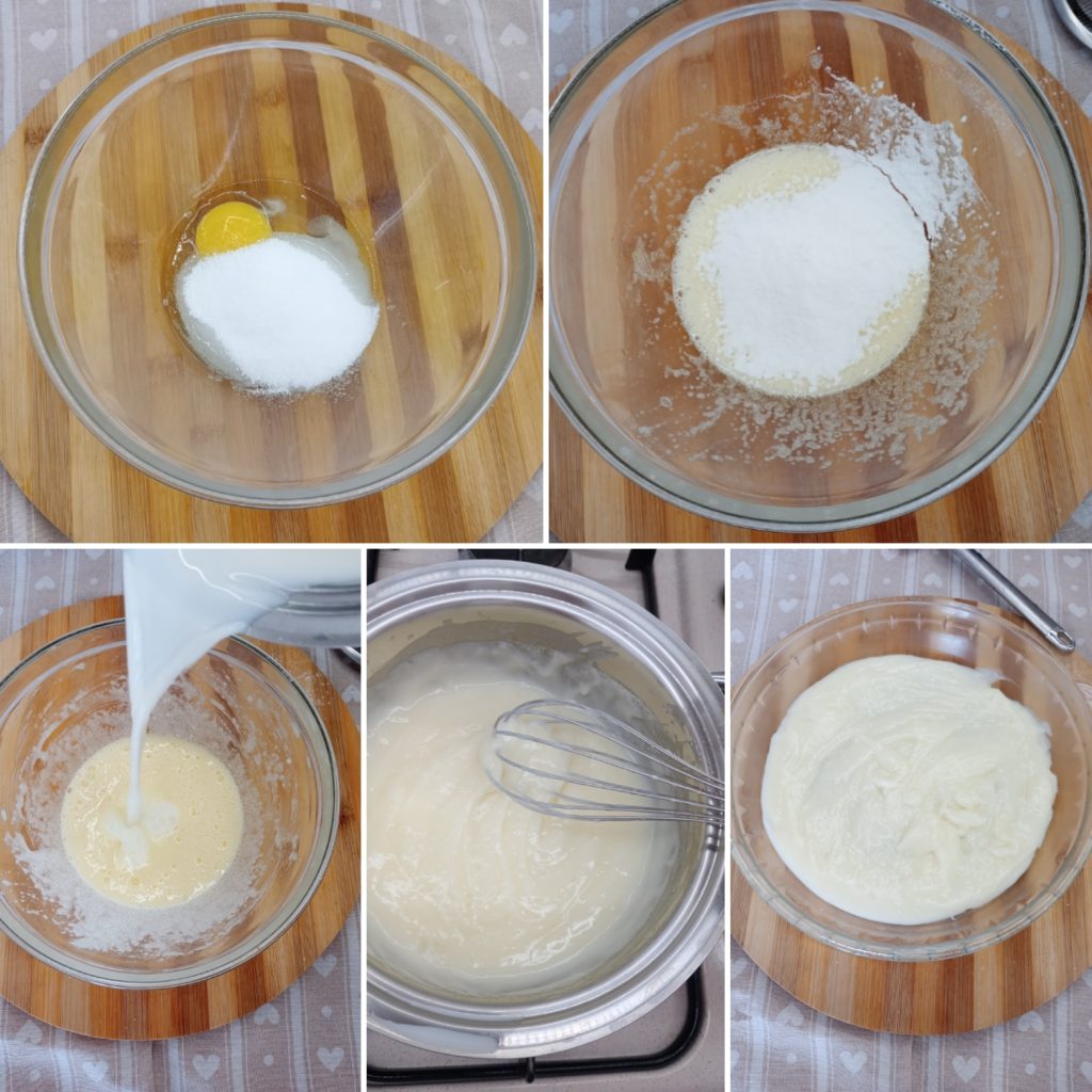 Mientras calientas la leche en la cocina, trabaja en un bol las yemas con el azúcar y el almidón de maíz (o harina). Toma un poco de leche caliente para templar la mezcla de huevos y almidón, luego vierte todo el contenido en la olla con la leche restante.