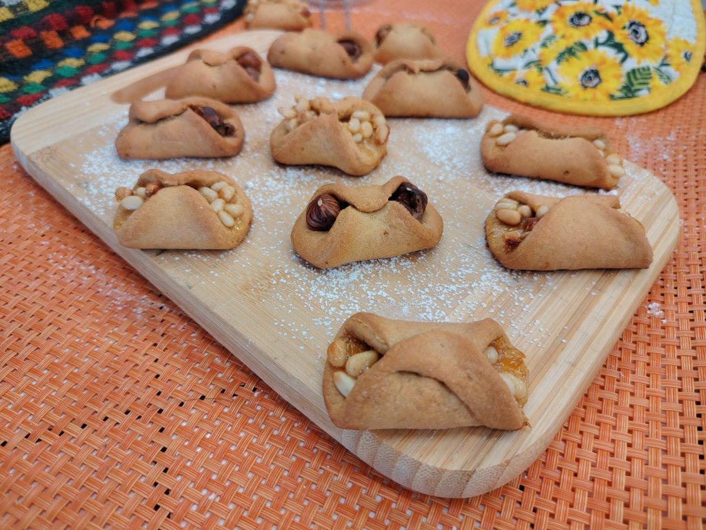 • Extender la masa obtenida sobre una superficie enharinada y, con un cortador o simplemente con un vaso, formar las galletas. Rellenar el centro con mermelada y piñones o, si lo preferís, con crema para untar y avellanas, o con lo que más os guste.