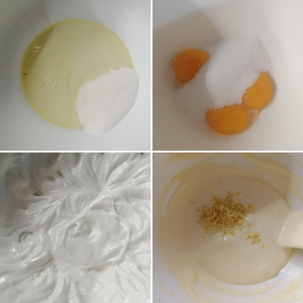 En otro bol, verter las yemas y montarlas con la otra mitad del azúcar hasta que estén espumosas y claras. Añadir también la ralladura de limón.
