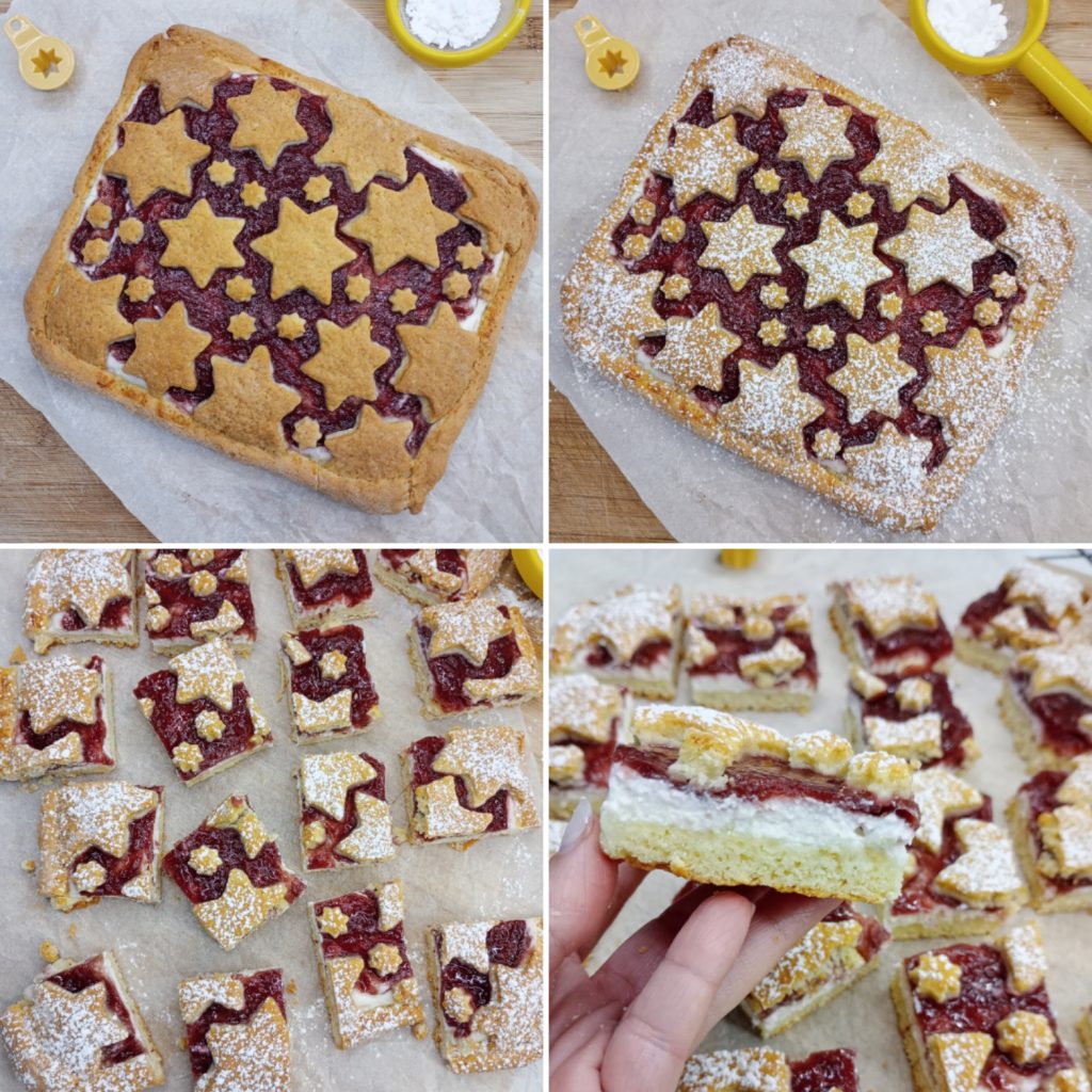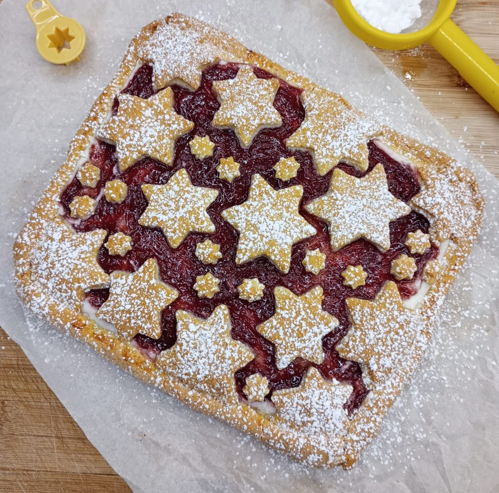 Extender el otro panecillo y realizar las formas que prefieras, yo elegí estrellitas. Cubrir la superficie a tu gusto, a lo largo de los bordes he colocado cordones de masa quebrada para evitar que el relleno se salga durante la cocción.