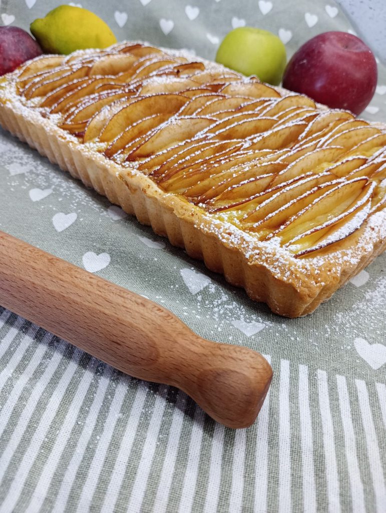 La base de masa quebrada suave acoge una deliciosa crema pastelera, y en la superficie coloqué muchas rebanadas de manzana. El resultado es un dulce aromático y crujiente, con una base suave y un relleno realmente delicioso.