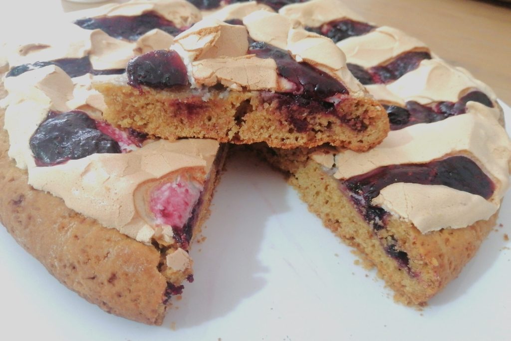 Tarta con mermelada de moras y glaseado de limón.