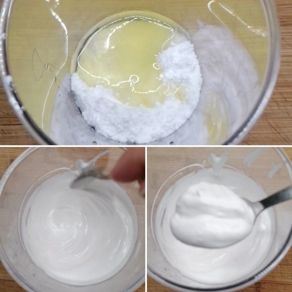 En un recipiente, verter el azúcar glas, las dos claras de huevo y la cucharada de zumo de limón y batir con las varillas eléctricas hasta crear una consistencia firme.