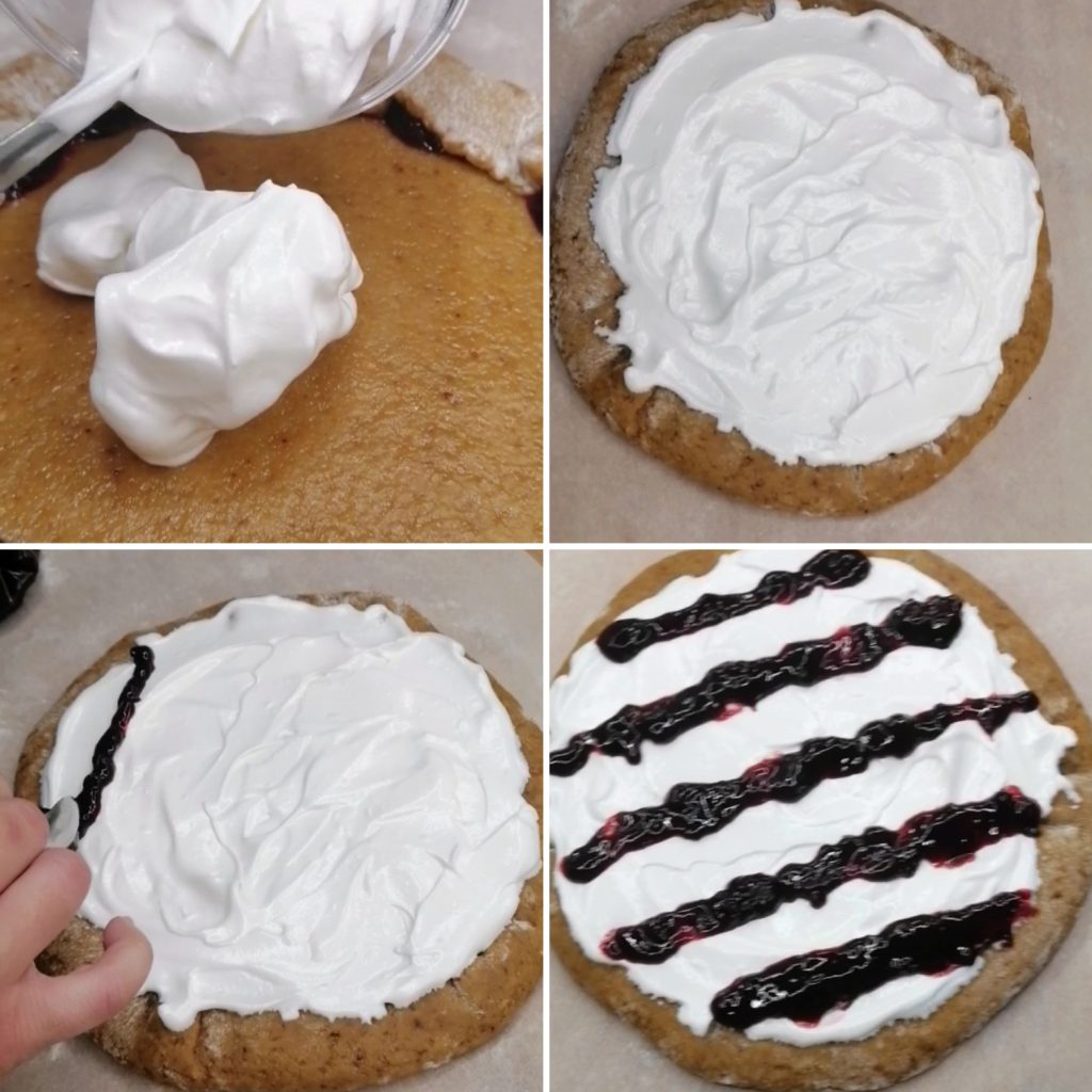 Con la ayuda de una cuchara, crear unas rayas con la mermelada de moras.He realizado la tarta directamente sobre una hoja de papel para hornear y luego la he puesto sobre la rejilla del horno. Pero si lo prefieres, colócala dentro de un molde.