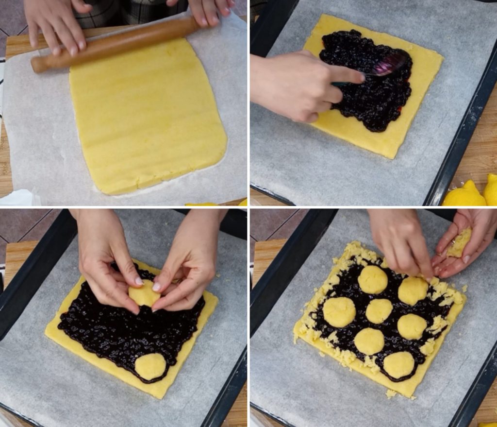 Yo he realizado un cuadrado (lo hice a ojo), recorté los bordes, rellené con mermelada de arándanos, y con la masa sobrante hice unas bolitas, las aplasté y las coloqué encima, la masa sobrante la desmenucé a lo largo de los bordes.