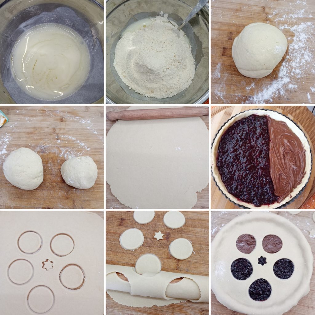 Extender la parte más grande y colocar dentro de un molde engrasado y enharinado de 24-26 cm aproximadamente, rellenar y nivelar bien (yo la he rellenado mitad con mermelada de moras y la otra mitad con crema de avellanas).