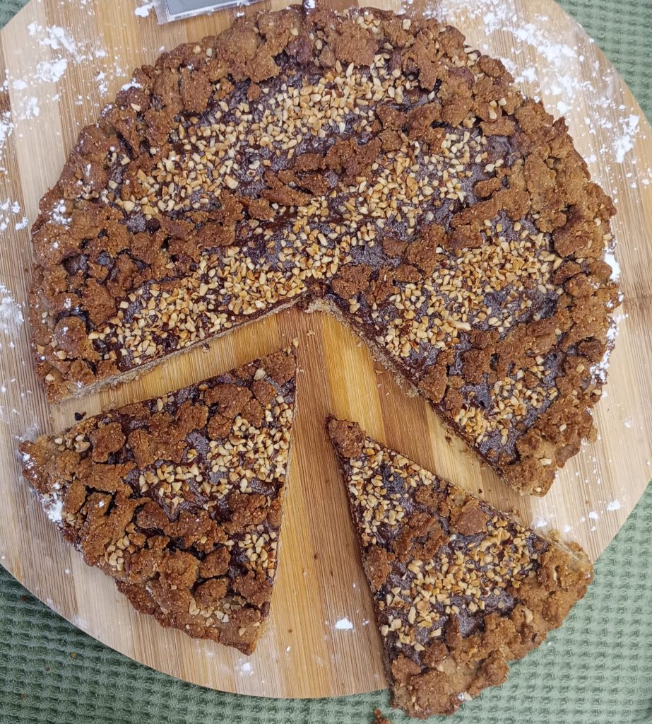Untar la crema de avellanas y con la masa que habíamos reservado, formar migas y distribuirlas sobre la tarta (decidid vosotros cómo distribuirlas).