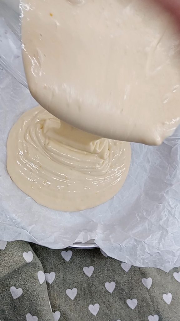 Verter dentro de un molde revestido con papel para horno. Si deseas rellenarla, como hice yo, coloca sobre la masa cucharadas de mermelada o crema de avellanas.