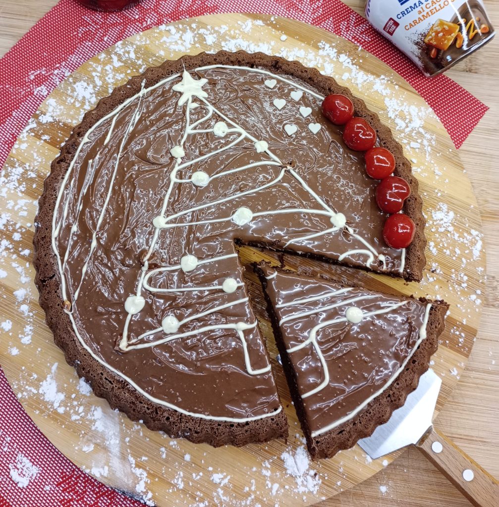 Una vez cocida, bastará dejarla enfriar y cubrirla con una excelente crema. Yo he elegido una crema para untar de cacao y caramelo salado y, en honor a la Navidad, he decorado la superficie con chocolate blanco creando un delicioso arbolito.