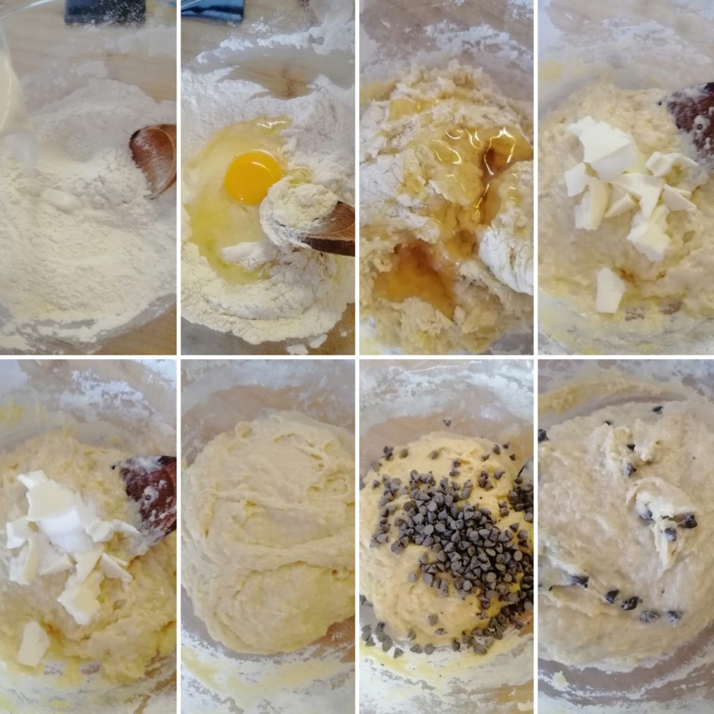 Añadir el huevo y la miel. Una vez que los ingredientes estén incorporados, añadir trocitos de mantequilla, añadir también la sal y finalmente el chocolate triturado. La masa debe ser suave y ligeramente pegajosa. (Si lo consideráis necesario, añadid un poco más de harina).
