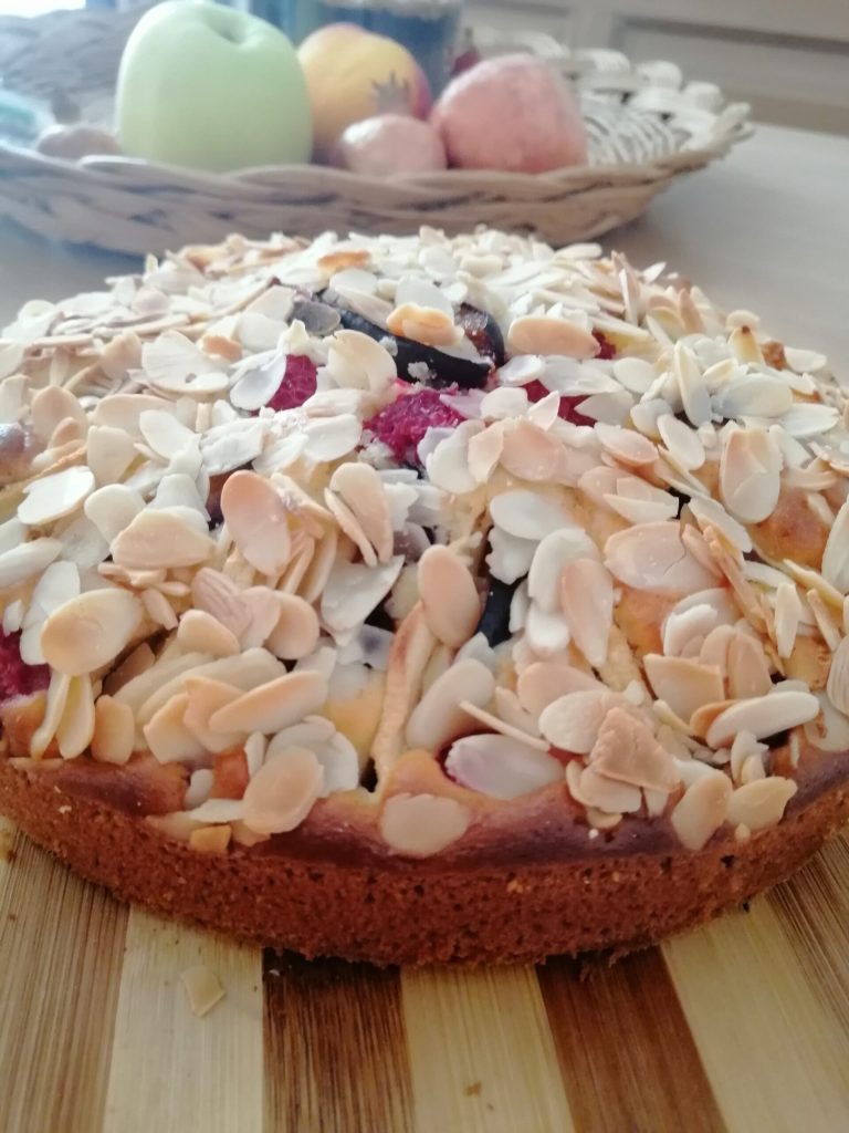 la tarta de vainilla con frutas y almendras está listísima para disfrutar.