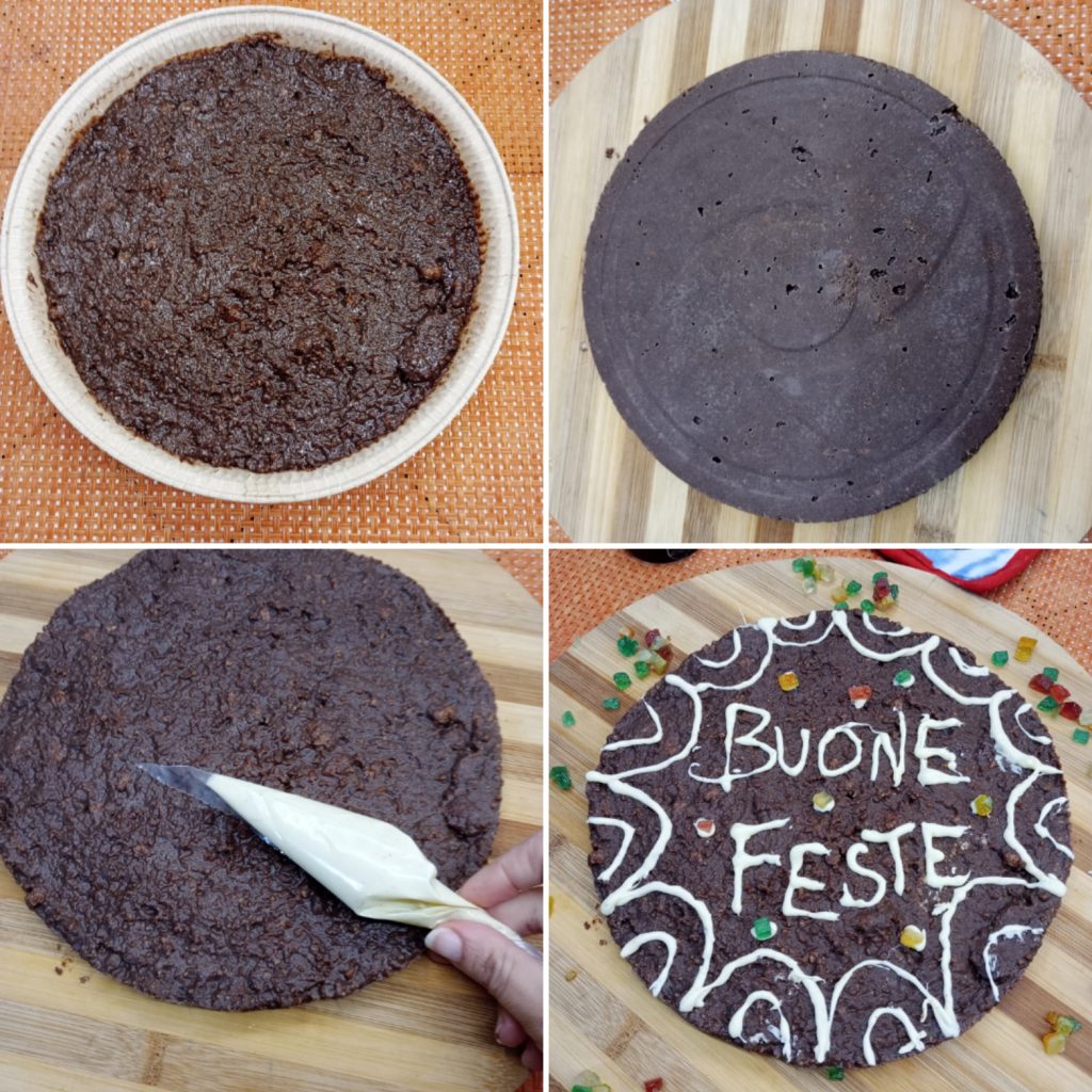Pasado el tiempo, sacad la tarta del molde. Derretid el chocolate blanco al baño maría o en el microondas. Con la ayuda de una manga pastelera o simplemente con una cuchara, comenzad a decorar la superficie de la Tarta Felices Fiestas.
