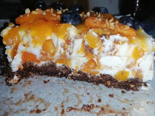 Retirad del fuego y dejad enfriar. Tomad la tarta de la nevera y verted la mezcla de albaricoques sobre la superficie, nivelad suavemente con una cuchara. Yo también he decorado con algunos gajos de albaricoques y arándanos. Ponédla en la nevera por al menos 4 horas (cuanto más tiempo, mejor)