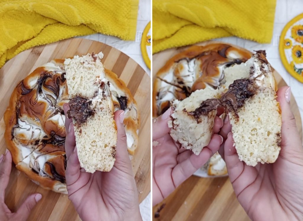 Prepara un molde de tarta de 20-22 cm (enmantecado y enharinado o forrado con papel de horno) y vierte la mezcla.Distribuye sobre la mezcla, de manera aleatoria, las cucharadas de yogur y las cucharadas de crema de avellanas. Con la punta de un tenedor, crea un efecto espiral o «marmoleado» para que los ingredientes penetren en la mezcla.