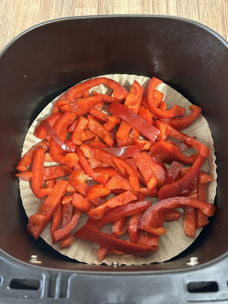 • Coloca el pimiento dentro del cestillo de la freidora de aire o, si prefieres, pon una hoja de papel de horno como hice yo. Si quieres ver las hojas que utilicé, haz clic aquí.
