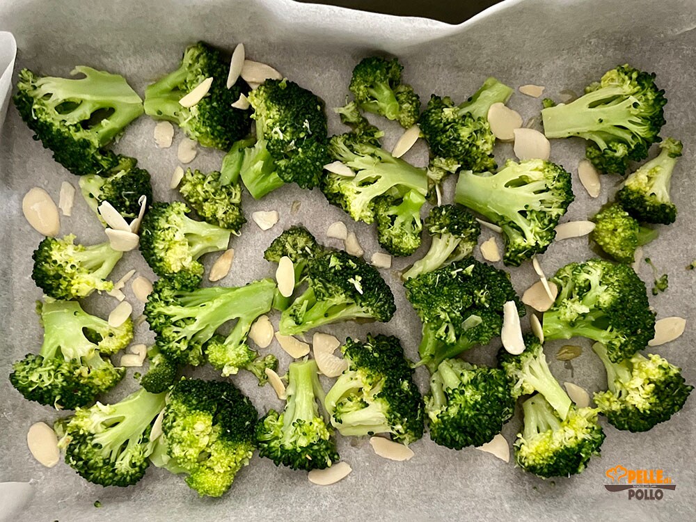 Forra una bandeja con papel de horno y coloca los brócolis. Espolvorea finalmente con un puñado de almendras en láminas.