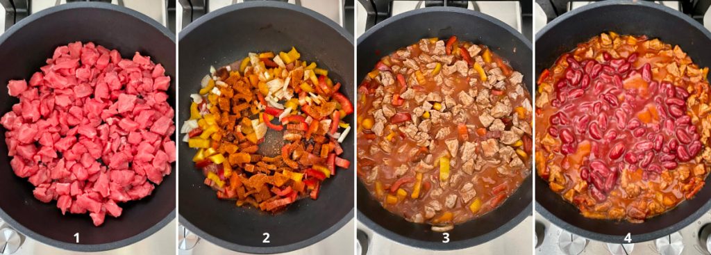 Añadan la carne dorada anteriormente, mojen con un poco de caldo y dejen cocinar (con tapa) durante aproximadamente una hora, a fuego bajo (3).