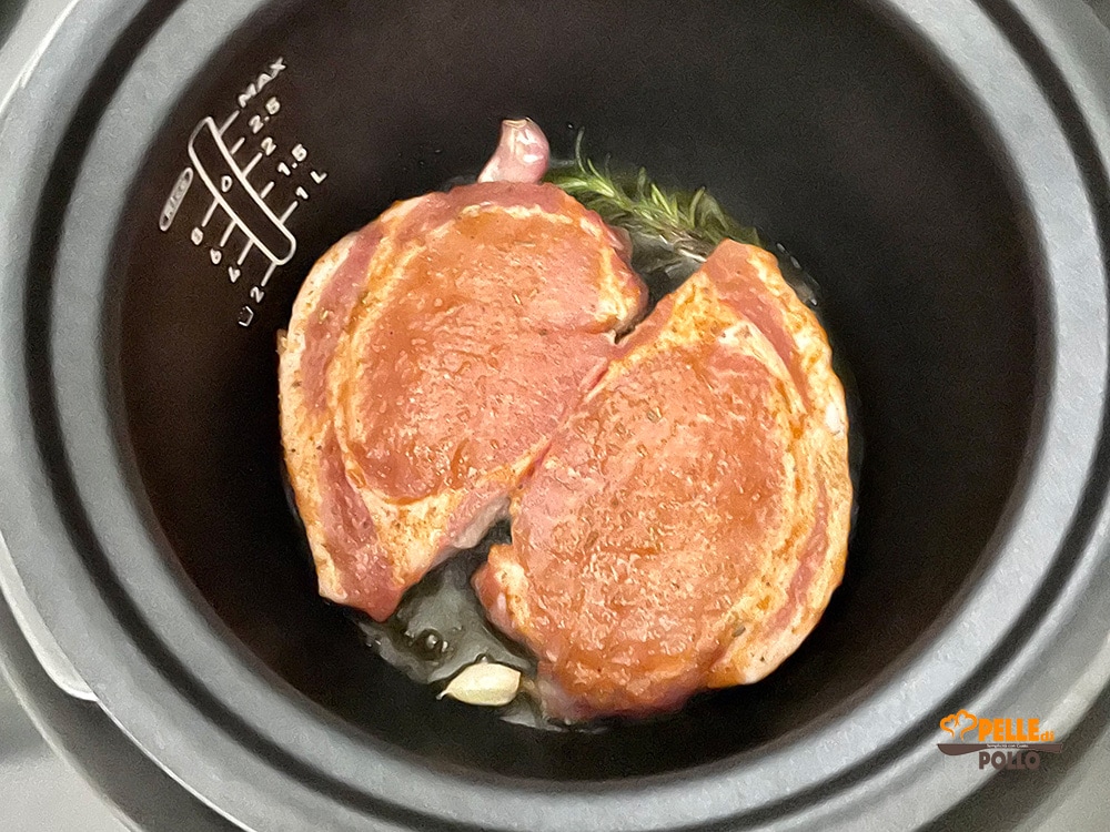 Pon en la olla del multicooker un diente de ajo, una ramita de romero y un chorrito de aceite. Sofríe por unos segundos, luego coloca las chuletas y dóralas por uno o dos minutos.