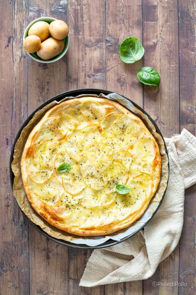 Hojaldre de patatas y queso stracchino, una tarta salada facilísima de preparar, perfecta como entrante, sola o acompañada de embutidos o verduras. El procedimiento es muy rápido, basta con cortar las patatas en rodajas finísimas y colocarlas sobre el hojaldre, junto con el stracchino… ¡después de la cocción al horno quedarán doradas, crujientes y sabrosas! ¡Prueba esta receta, es sencilla pero realmente deliciosa!