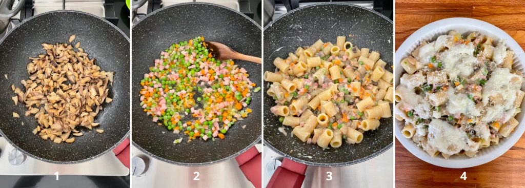 La pasta al horno con guisantes, champiñones y jamón está lista para ser servida en la mesa… ¡buen provecho!