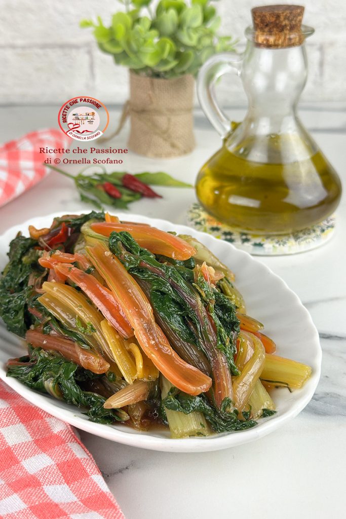 • Empezamos a cocer en agua hirviendo las pencas durante unos minutos, yo 5 minutos, luego añadí las partes verdes que tienen una cocción más rápida, las dejé unos 7-8 minutos más al fuego y luego escurrí la verdura con un escurridor.