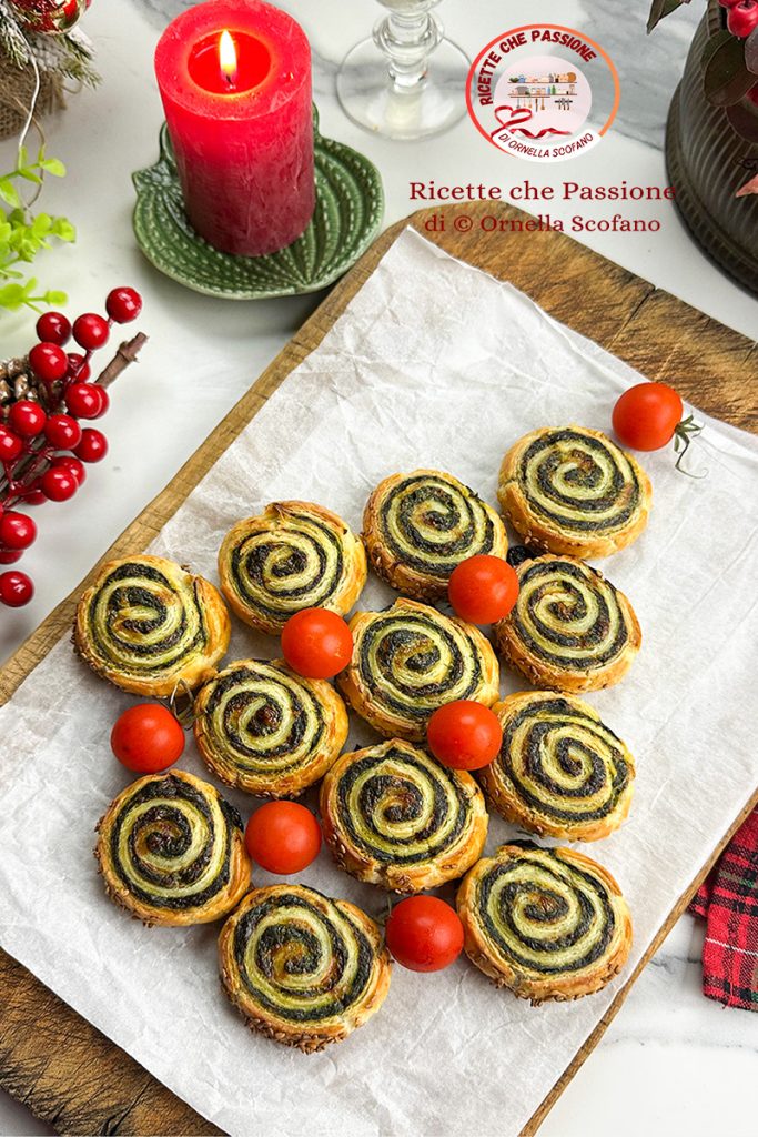 Árbol de hojaldre con espirales ricotta y espinacas, elegante y delicioso, luce muy bien en la mesa. Qué delicia tener la mesa llena de entrantes en Navidad, yo podría cenar y almorzar solo con entrantes variados. No puede faltar el clásico entrante en forma de árbol de Navidad, y este año he pensado en realizarlo con las espirales navideñas ricotta y espinacas realizadas con la masa de hojaldre. Para comodidad yo he realizado unas espirales separadas entre ellas que he acercado después de la cocción, para realizar el árbol, pero se pueden ya poner antes de la cocción en posición para realizar el árbol, de modo que todas las espirales estén conectadas entre ellas, yo he preferido hacerlas separadas porque es más práctico para comer, cada uno coge la suya sin tocar las otras. Para decorar unos tomatitos y si quieren también unas estrellitas de queso, yo como siempre lo pienso después de haberlo comido, y haréis un gran papel porque son deliciosas, por decir poco. Os cuento un episodio, la noche que realicé esta receta, me alejé un momento de la mesa para completar un trabajito en el pc, y cuando vuelvo la sorpresa, mi marido que no ama el hojaldre se las había comido todas, dejándome con las ganas de comerme un par más, así que estarán también en mi mesa de Navidad, y con estrellitas de queso incluidas, basta con sacarlas con cortadores para galletas.