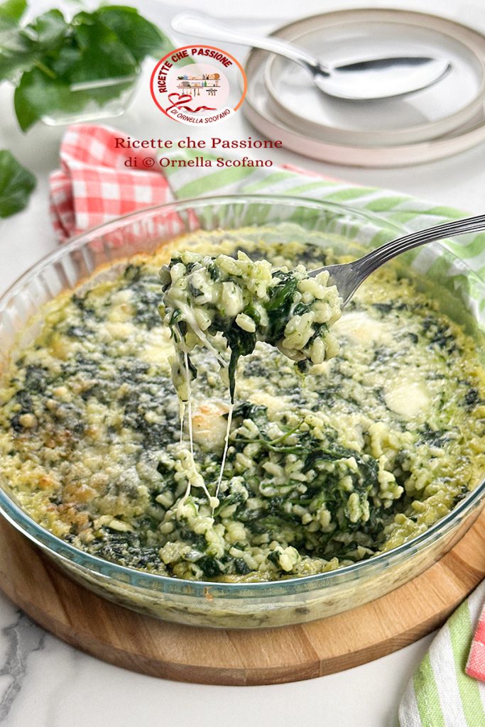 ¡Atención todos! Hay que probar este buenísimo arroz al horno con espinacas y gorgonzola, lo preparé en abundancia para el almuerzo de hoy, con la esperanza de tener algo para la cena, pero estaba tan bueno que lo devoramos todo, ni siquiera quedaron las migas en la bandeja. Un primero adecuado para toda la semana, pero tan bueno que es perfecto incluso para el almuerzo del domingo, luego con las espinacas frescas es tan bueno y primaveral que es perfecto para la temporada que está por llegar, ya falta poco para la primavera y luego la Santa Pascua. Prepararlo es realmente sencillísimo y se necesita muy poco, yo usé como arroz un arroz para arancini que leyendo en el paquete indicaba que era apto para el horno, de hecho, aguanta muy bien la cocción, espinacas frescas y como gorgonzola a mí me gusta mucho el gorgonzola picante, basta poco para darle un sabor especial, luego tenía también provola y me dije, ¡pues un poco no viene mal! Al final, como plato único está bien añadir algo más. Veamos cómo prepararlo, y os revelo mi truco para tener un arroz al horno cremosísimo, como un risotto.
