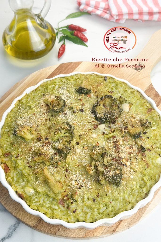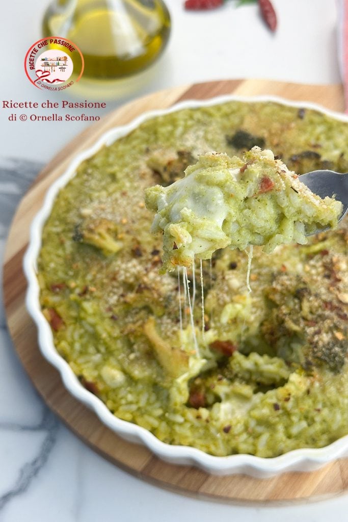 Arroz con crema de brócoli fundente al horno, un primer plato perfecto para todos los días de la semana o incluso para el almuerzo del domingo de lo bueno que está, y se hace rápidamente, palabra mía, en 20 minutos ya estará en el horno y allí como máximo 15 minutos para derretir bien la provola en el corazón del pastel de arroz al horno sazonado simplemente con crema de brócoli y un poco de sopressata o schiacciata calabrese. No os imagináis lo buena que está la crema de brócoli que he preparado cocinando los brócolis directamente ahogados en la sartén, simples a la calabresa con ajo y guindilla que no pueden faltar en la base del sofrito, sofrito que yo hago apenas, sin dorar demasiado el ajo para no arriesgar quemarlo. Claro que he añadido también el salami para enriquecer un poco el plato y hacerlo un perfecto plato único, pero no es fundamental, se puede preparar de hecho también sin él en una forma vegetariana igualmente deliciosa. El otro día había preparado el arroz con crema de calabaza y queso que tanto os gustó, y con esta nueva receta quise satisfacer también a quienes me habían pedido versiones similares con otras verduras, así que veamos cómo prepararlo. Otras recetas con brócoli o arroz.